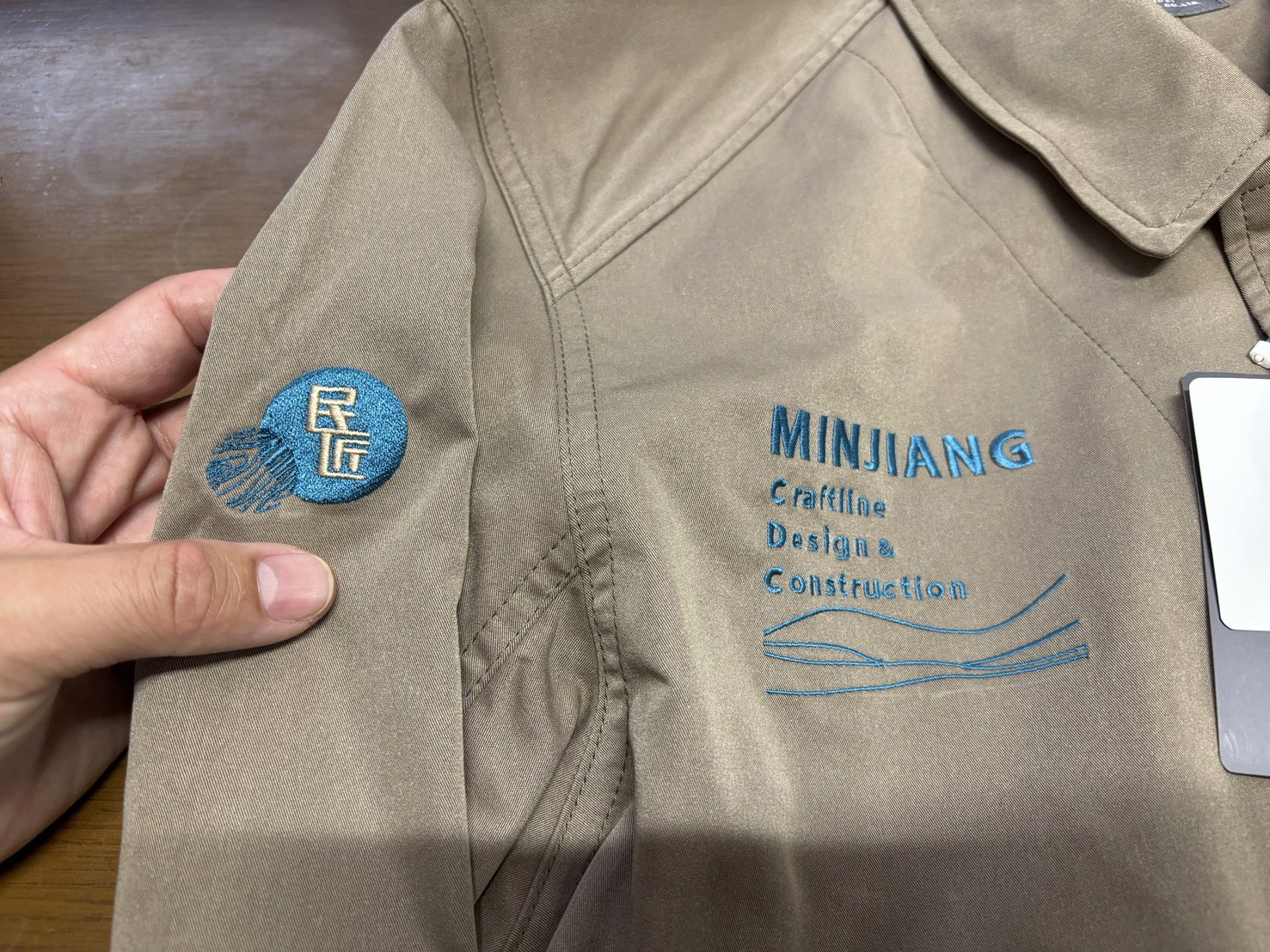 作為民匠整體員工的門面制服,選用了帶有暖灰調的長袖薄外套款型,材質硬挺,胸前和右臂綴有民匠的 LOGO 刺繡。